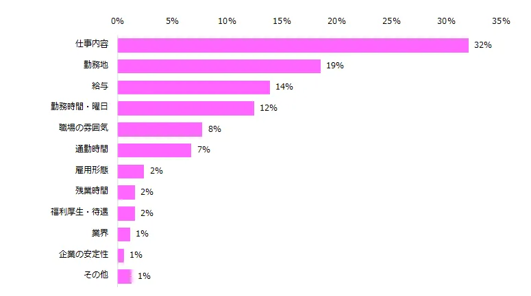 仕事を選ぶ際に最も重視していることを伺うと、第1位は「仕事内容」(32%)でした。次いで「勤務地」(19%)、「給与」(14%)が続きました。年代別で見ると、20代は他の年代に比べ「職場の雰囲気」(20代:16%、30代:10%、40代:5%)、30代は「勤務時間・曜日」(同:9%、18%、12%)、40代は「仕事内容」(同:27%、33%、33%)を重視していることがわかります。