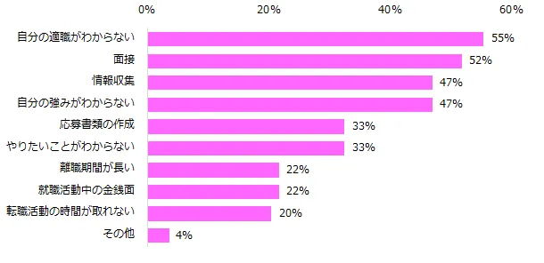 転職経験がない方に、初めて転職するにあたって不安なことを伺いました。半数以上の方が回答したのは「自分の適職がわからない」(55%)、「面接」(52%)でした。その他には「結婚しているため妊娠出産子育てを考慮されてしまう可能性があること」「新型コロナの求人への影響」といったコメントが寄せられました。