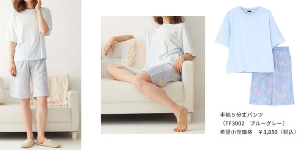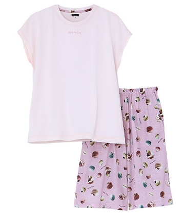 「Tuché」スイーツファブリックシリーズは、素材の特長をスイーツにまつわる言葉で表現したシリーズで、これまで「バターサテン」「ホイップニット」「カヌレベロア」などを発売。素材にこだわったやさしい着心地と大人かわいいデザインが人気のシリーズです。今回発売した「マカロン天竺」は、ふんわりやわらかな肌触りの素材を採用。マカロンのような カラーリングや、柄のバリエーションにもこだわりました。リラックスタイムに活躍する半袖やフレンチ袖のトップスと5分丈パンツのセットアップ「ROOM」、お手持ちのトップスと組み合わせて楽しめる「Half Bottom」、襟元のシルエットが かわいらしいシャツスタイルの「NIGHT」をラインアップしました。気分やシーンに合わせて楽しめる「Tuché」スイーツファブリックのウェアで、快適なおうち時間をお過ごしください。