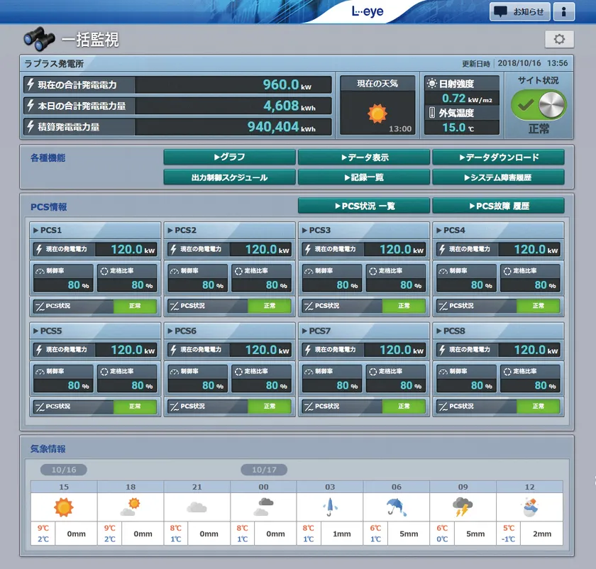 遠隔監視システム&サービス L・eye は、追加機器不要で出力制御に標準対応し、すでに4,000件以上の出力制御対応実績があります。現在までに31社もの出力制御対応PCSメーカーと共同でJET(一般財団法人電気安全環境研究所)による認証を受けており、PCS対応力は業界トップクラス。スムーズな出力制御と高機能監視を両立することで選ばれ続けています。