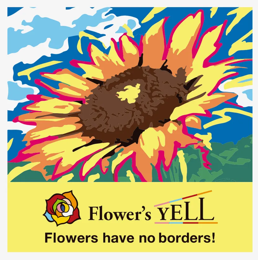 今回開催する「Flower's YELL」第2弾は、ペイントアーティストの桂川桃子さんによる向日葵の原画を、世界的な花絵師の藤川靖彦が創作します。発信するメッセージは、「Flowers have no borders!(花を愛でる心に国境はない!)」。世界がひとつとなって、新型コロナウイルスと立ち向かい、そして勝利することを呼びかけます。