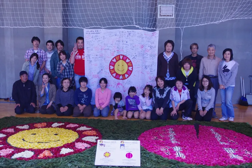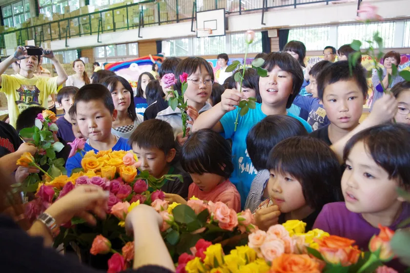 私たちはインフィオラータを日本で始め、その年10年目を迎えました。花は人の心を和らげ、活力を与えてくれます。そこでインフィオラータを通じて、花で被災地にエールを送ることを考え、2011年4月、被災地に10万本のバラの花を届ける被災者応援プロジェクト「Flower's YELL」を立ち上げました。全国各地で開催されるインフィオラータの会場で寄せられた募金を、10万本のバラの花に変え、4月29日から、震災で被害の大きかった地域の避難所・学校・病院等に、直接届けるとともに、様々なアーティスト達が描いた応援のイラストで、被災者の方々とインフィオラータをつくりました。