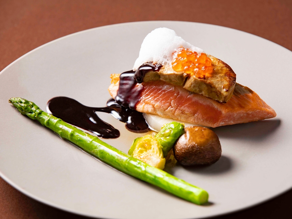 ロッシーニとは、一般的に牛フィレ肉を使用して、フォアグラとトリュフで仕上げた料理です。鮭ディナーでは、鮭のフィレといくら、昆布の泡で仕上げて提供します。
