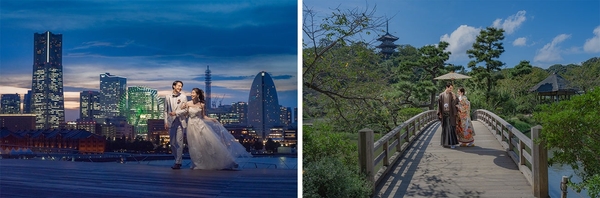 横浜駅前店での撮影は、横浜みなとみらい店のプランと組み合わせることも可能。「大さん橋」「三渓園」など人気スポットでのロケーション撮影や、屋内庭園スタジオなど、組み合わせることで和装・洋装さまざまな写真を残すことができます。