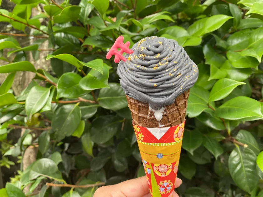 スリーブには、彩り鮮やかな舞子さんの着物をあしらっていますが、今回新登場の「舞子さんチーズソフト」は、姿形がそのまま舞子さんを映したような見た目です。その秘密は、こだわりチーズソフトの上に黒ゴマのモンブランペーストと華やかなキラキラ金箔、舞子さんのかんざしをイメージしたフランボワーズと京都をイメージした小さな鳥居がちょこんと添えられています。お味も黒ゴマペーストから漂う、ごまの香りとさっぱりチーズが混ざり合い、まさに和と洋の融合を実現した京都観光にぴったりのソフトクリームです。ぜひ、清水寺観光の際に食べ歩きスイーツとしていかがでしょうか。