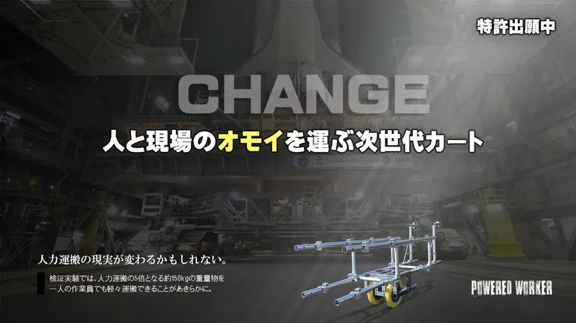 代表酒井が過去に建設業の経験で現場環境の過酷さを痛感。日常的に重量物を人力によって運搬することに疑問を感じ、作業現場の過酷な環境でもカタチを変えて重量物も簡単に運べる台車があればと考え、パワードワーカーを開発しました。