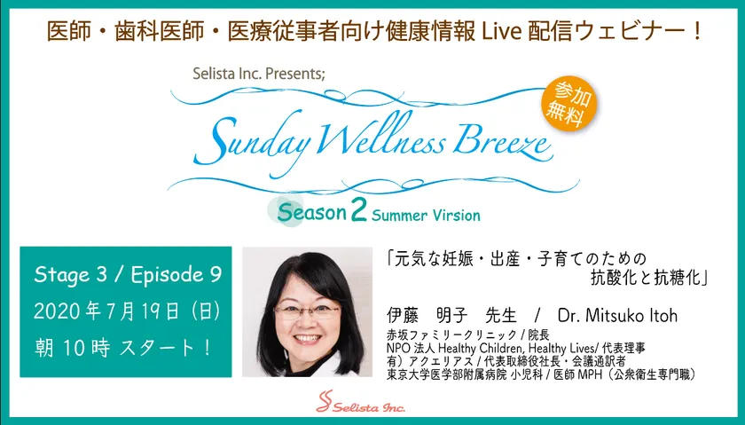 セリスタ株式会社(東京都千代田区、代表取締役:伊藤 承正)は、伊藤 明子(いとうみつこ)先生(赤坂ファミリークリニック 院長、NPO法人Healthy Children, Healthy Lives 代表理事、東京大学医学部附属病院 小児科)による医師・歯科医師・薬剤師・医療従事者向け無料Live配信ウェビナー『元気な妊娠・出産・子育てのための抗酸化と抗糖化』を2020年7月19日(日)朝10時から開催いたします。