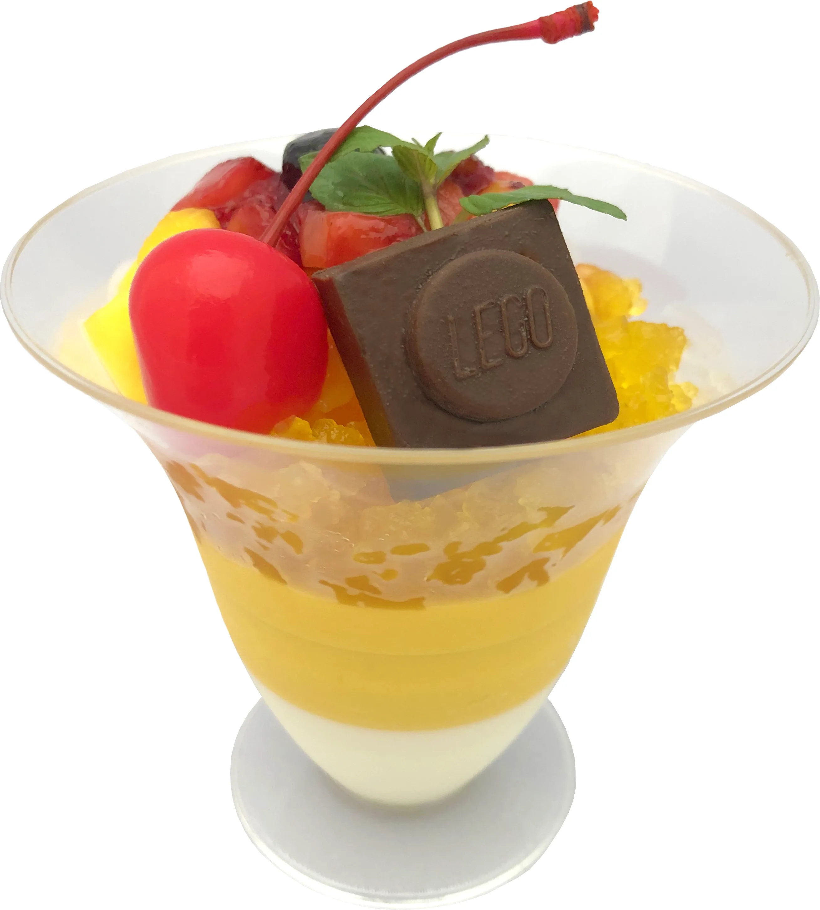 さっぱりとしったパッションフルーツとマンゴープリンに、さくらんぼとブロックチョコレートをトッピング。