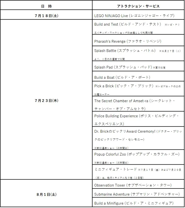また、ゲストが持参したミニフィギュアを交換できる『ミニフィギュア・トレード』も、新しい交換方法に変更して再開します。さらに、今春より新登場の予定だった2つの通年ショー『ポップアップ・カラフル・ズー』『ドクター・ブリックのビックリアワード・セレモニー』も開始します。