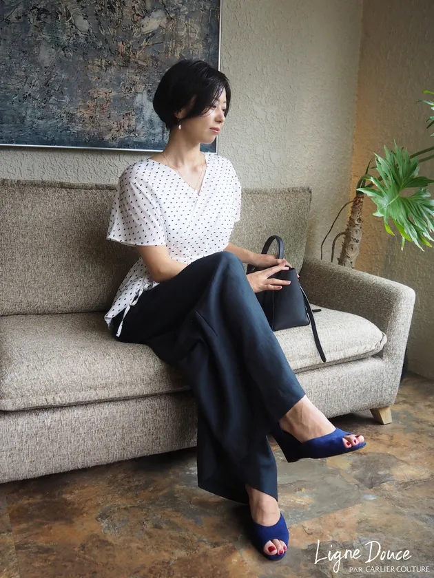 ものが溢れている時代だからこそ、効率重視の大量生産ではなく、アトリエで一つひとつ丁寧にクリエイションを行なってきた「CARLIER COUTURE」。多くのドレスやフォーマルウェアをつくるなかで、日常のなかでもそのエスプリを取り入れられるブラウスやワンピースを仕立てて欲しい、という声を受けて誕生したのが「Ligne douce par CARLIER COUTURE」です。ドレスアトリエとして、ブランドが得意とするクラシカルでレディライクなテイストはそのままに、アパレル産業が抱える環境問題や生産背景の課題に真摯に向き合うものづくりを追求。
