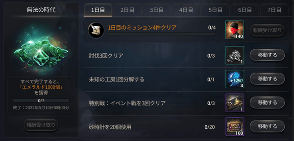 全ミッション達成で「エメラルド1000個」が獲得できます。