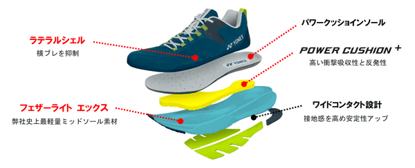 新ソール設計である「ワイドコンタクト設計」は、横幅を拡げ接地面積を増やし、外側には、バドミントンシューズに採用している高強度フィルム「ラテラルシェル」を新たに搭載。踏ん張った際のパワーロスや横ブレを抑え、安定性・サポート性が向上します。