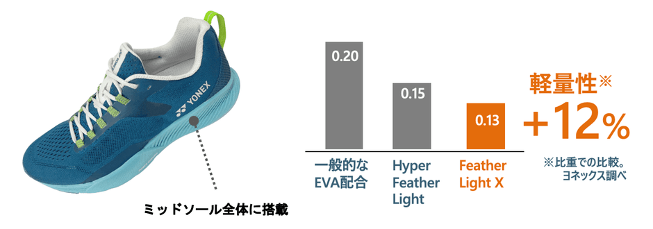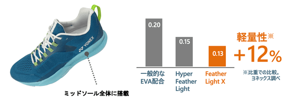 ミッドソール全体には弊社史上最軽量※4素材「フェザーライト エックス」を採用し、一般的なEVA材より約30%※5の軽量化を実現。高機能の軽量素材をミッドソール全体に配置することで、女性用23.5cmは約205g、男性用26.0cmで片足約230g、という軽さを実現しました。