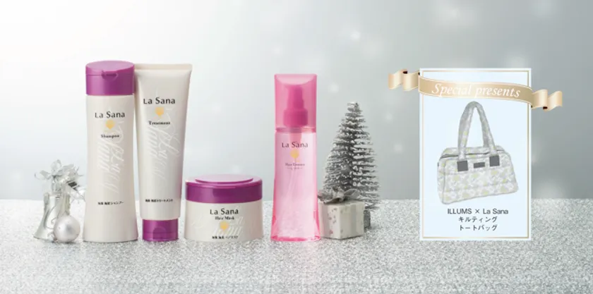 『ラサーナ クリスマス コフレ 2020』は1年で最も華やぐクリスマスシーズンに向け、“ホームケアで、輝く美髪へ”をコンセプトにラサーナの人気アイテムを揃えた全5種類。髪のお悩みに合わせてたっぷりと贅沢な美髪習慣を体感できる限定ヘアケアコフレです。今年のコフレご購入特典は"ILLUMS”とのコラボバッグ!北欧由来のデザイン性と機能性を兼ね備えたキルティングトートバッグをご用意しました。「自分が気に入ったものを長く大切に使い続け、使い込むほどに愛着が増していく...」そんなILLUMSの考え方。ラサーナも同じく、「長く皆様に愛され、使い続けていただけるような商品をこれからもずっとお届けしたい」という想いを重ねたコラボ企画です。