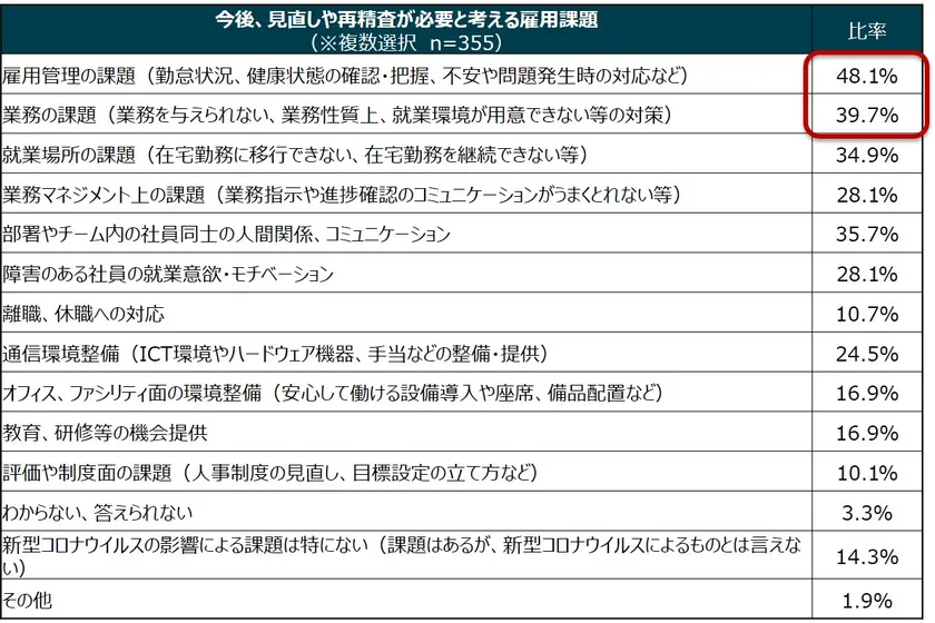 新型コロナウイルス発生後では、より雇用の「継続性」を重視する傾向が出ており、障害者雇用においても、在宅勤務を前提とした雇用管理や健康支援、体制づくりが急務となっています。