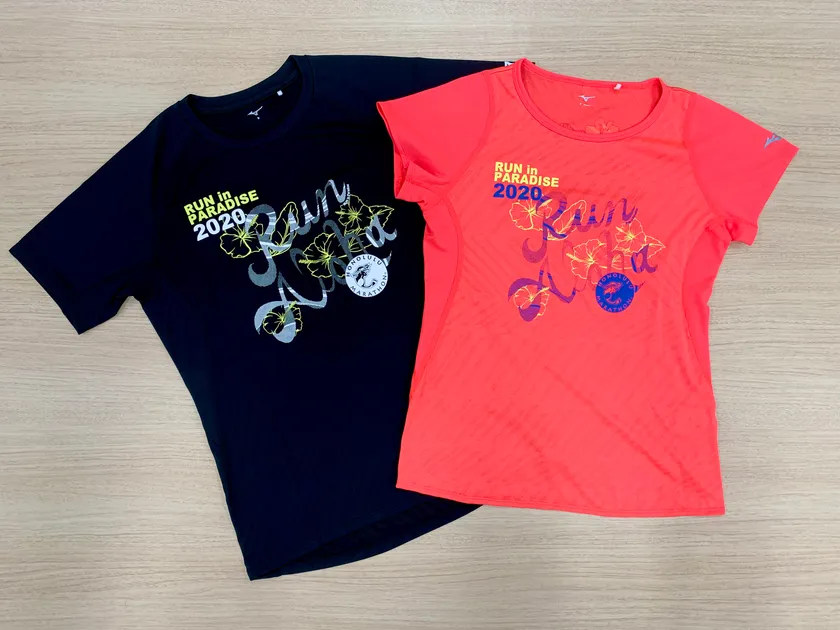オフィシャルトレーニングTシャツは、暑い季節のトレーニングにも最適な、通気性の良いジャガード素材を使用、「RUN IN PARADISE2020」のメッセージと「Run Aloha」の文字がデザインされた男女別それぞれ4色展開で公式ショップでしか手に入れられないものです。オリジナルマルチフェイスガードは、ハワイモチーフのブルー系とピンク系の2種類。ランニング時の飛沫防止エチケットとなるフェイスガードのほか、ヘッドバンド、ヘアタイ、キャップ、リストバンド、ネックウォーマーとマルチにご利用が可能です。いずれも今大会よりサポーティングスポンサーとなったミズノ製です。