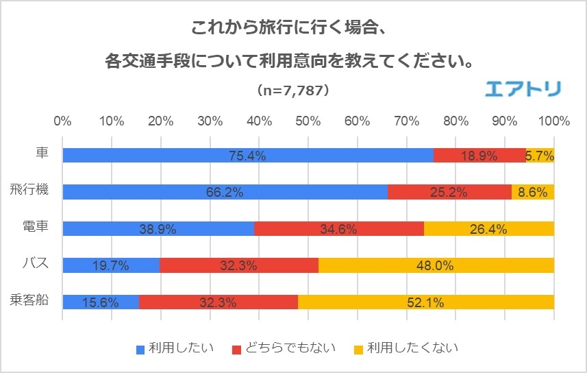 最も利用意向が高いのは三密を避けることができる「車」。一方で、「飛行機」も66%が「利用したい」と回答。
