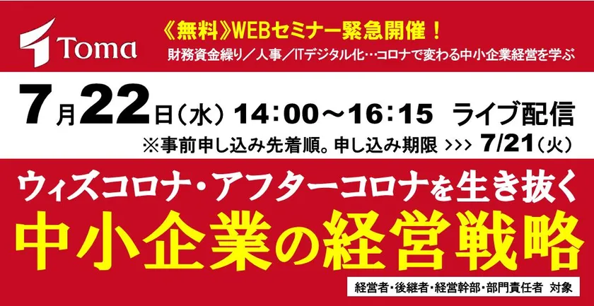 “100年企業創り”を支援するTOMAコンサルタンツグループ(所在地:東京都千代田区、代表取締役社長:市原 和洋)は2020年7月22日、中小企業の経営者・後継者・経営幹部・部門責任者を対象とした無料WEBセミナー「ウィズコロナ・アフターコロナを生き抜く中小企業の経営戦略」を緊急開催します。