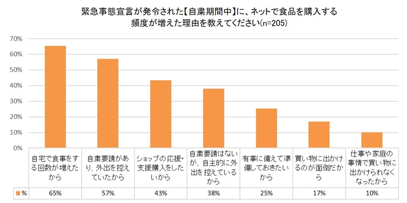 (3)緊急事態宣言が発令された【自粛期間中】に、ネットで食品を購入する頻度が増えた理由を教えてください(n=205)