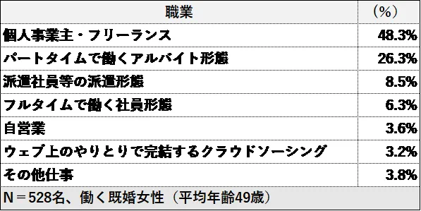 コメントには、家庭と仕事のバランスのとりやすさに関する、「家事の合間にできる範囲で働くことができているから(40代個人事業主)」や、「無理なく時間的にも余裕を持って働くのが理想的で今はそれを保てている(40代個人事業主)」といった声や、「リモートでできる仕事が増えて、家事との両立がしやすくなった(50代パート)」といった、コロナをきっかけに働き方に変化したことで、希望通りの働き方に近づいたといった声がありました。