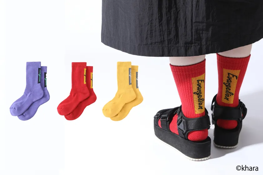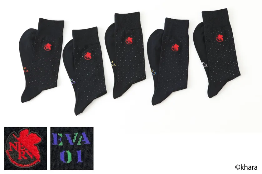 今回コラボレーション展開する商品は、エヴァの機体カラーをモチーフに、ストリートソックスに落とし込んだ2アイテムと、ビジネススーツに合わせてはけるビジネスソックスの計3種類です。いずれも数量限定での展開となります。