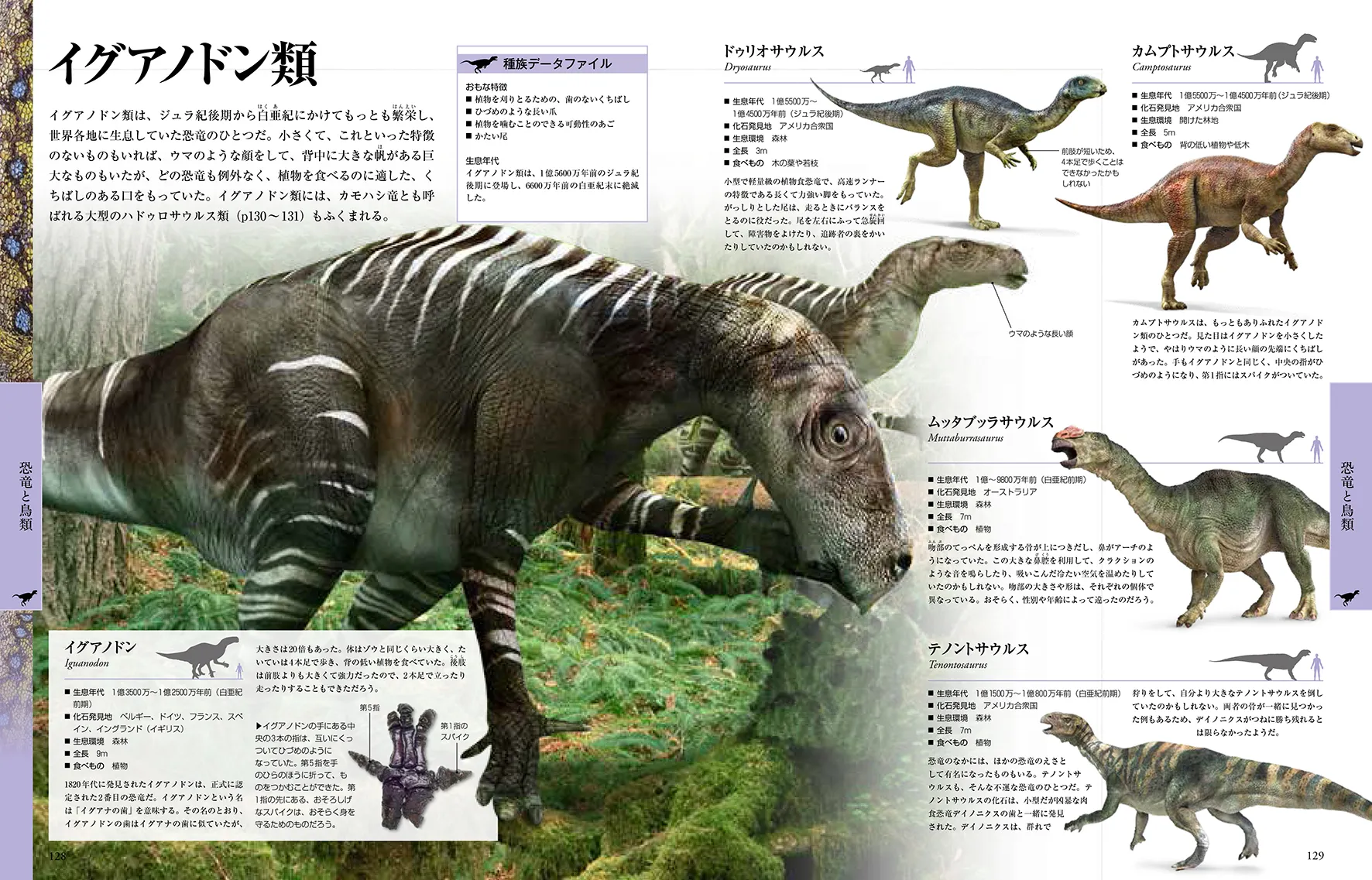 ■「生息年代」「化石発見地」「生息環境」「全長」「食べ物」を網羅。