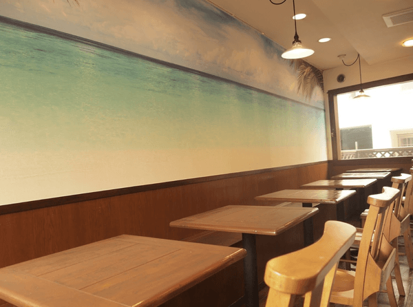 店内は心地良い沖縄民謡の音色が流れており、ドアを開けた瞬間、地平線まで広がるコバルトブルーの海と空が描かれた壁に目を奪われます。