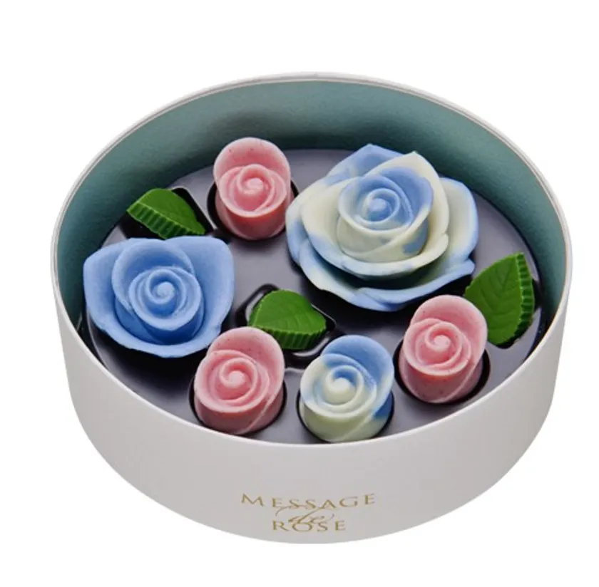 ホワイトとブルーのマーブルの大輪の薔薇、ピンクが鮮やかな小薔薇、濃い緑のコントラストが映える、まるで芸術品のような美しく繊細なチョコレート。箱を開けた瞬間の驚きをお届けします。
