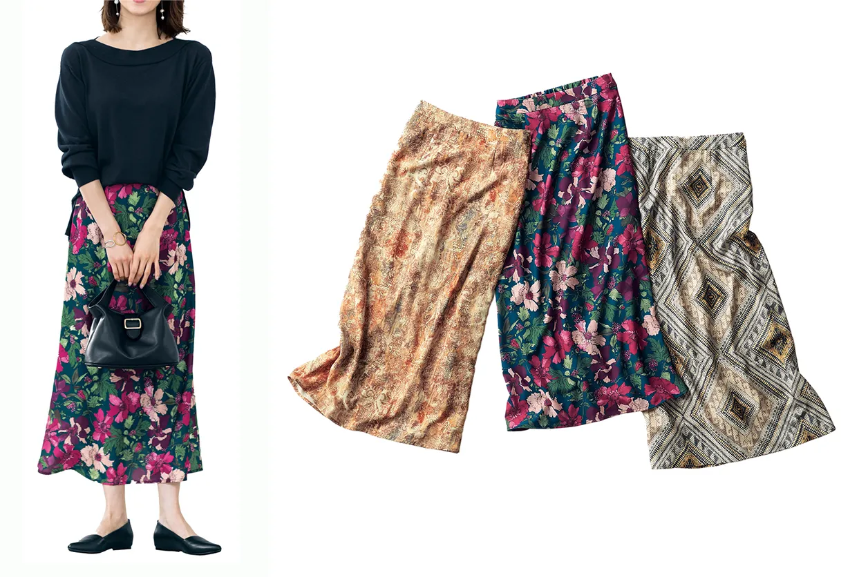 スカートの作製は日本製にこだわり、国産の生地を京都の老舗染工所で丁寧にプリントし、縫製も安心品質の国内で行いました。また、デザインはトレンドのナローシルエットを採用。まとうだけで心がときめき、着こなしが一気に華やぐ、理想のスカートが完成しました。