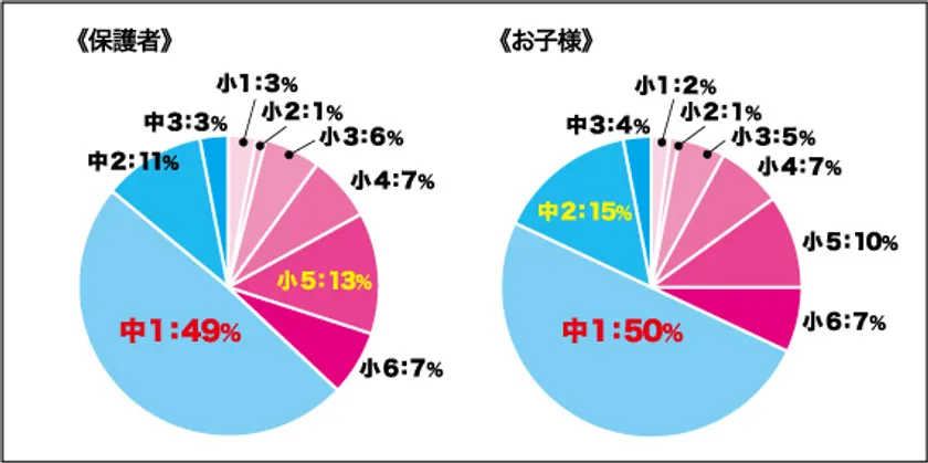 次に多いのが、保護者では小学5年生の13%、お子様では中学2年生の15%となりました。