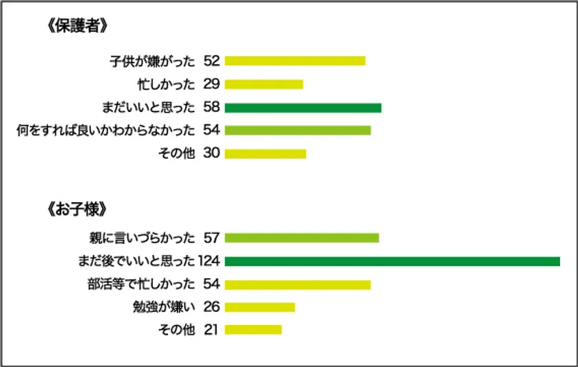 お子様では、「言いづらかった」57名、「部活などで忙しかった」54名となりました。