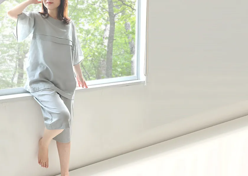 「涼しい」×「軽い」×「柔らかい」を両立させた、1重ガーゼ × 伝統技法の和晒製法で作られたパジャマです。レディース、メンズ、年齢も選ばないシックで高級感のある13色のカラーバリエーションに、サイズはXSから5Lまで8サイズ展開し、ご要望に応じてセミオーダーを承ります。