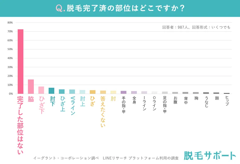 完了済の部位については、「完了した部位はない」が72.5%と圧倒的に多い一方で、脇は16.2%、ひざ下は8.2%、肘下は6.8%。人気の部位は現在処理している部位と一緒でした。
