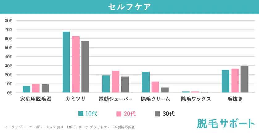 ただし、「カミソリでセルフケアだけ」という方は全体の約21%に留まり、併用してサロンやクリニックへ通っていたり、家庭用脱毛器や除毛ワックスを併用している方々が40%と多いことが分かりました。