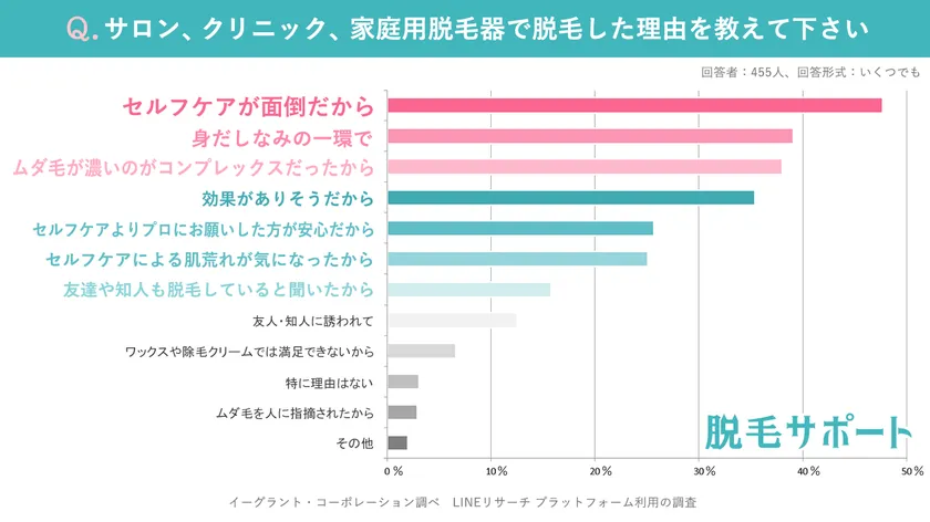 サロンやクリニック、家庭用脱毛器で脱毛をしている女性455人にその理由を聞いてみたところ、「カミソリやシェーバー、毛抜きでのセルフケアが面倒だから」が47.7%、「身だしなみの一環で」が39.1%、「ムダ毛が濃いのがコンプレックスだったから」が38%、「効果がありそうだから」が35.4%となりました。