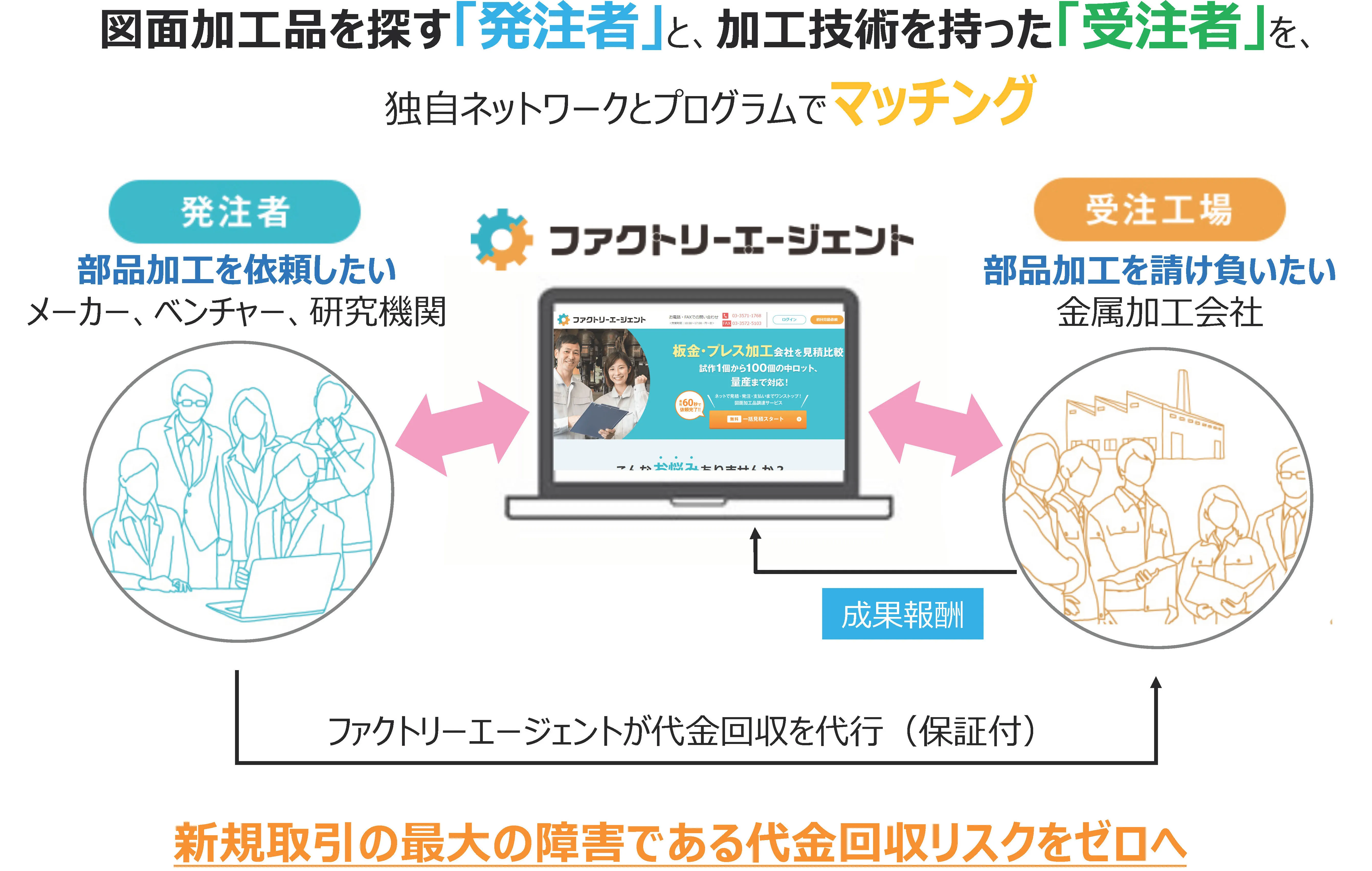 また、ファクトリーエージェントが代金回収を代行し、町工場や中小企業における新規取引の最大の障害である代金回収リスクをゼロにします。