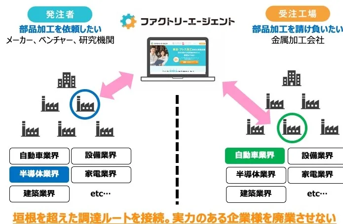また、これまで同一メーカー・業種を頂点としたクラスター構造でしたが、ファクトリーエージェントは「業界の垣根を越えた調達ルート」を構築することで、実力ある中小企業・町工場に新たな需要を創出いたします。