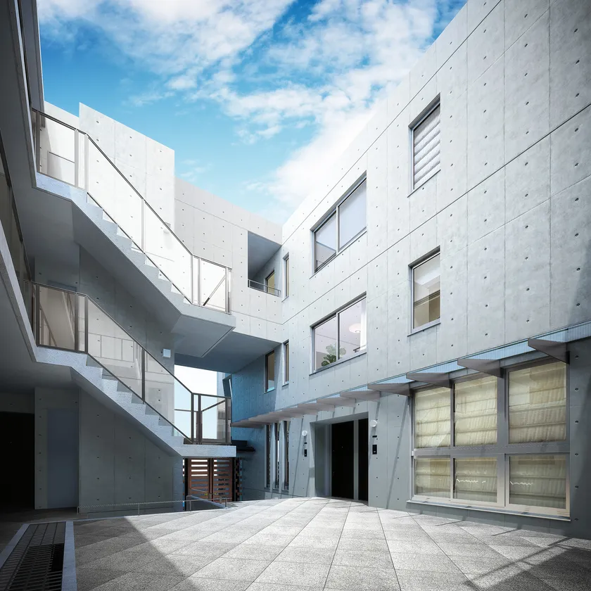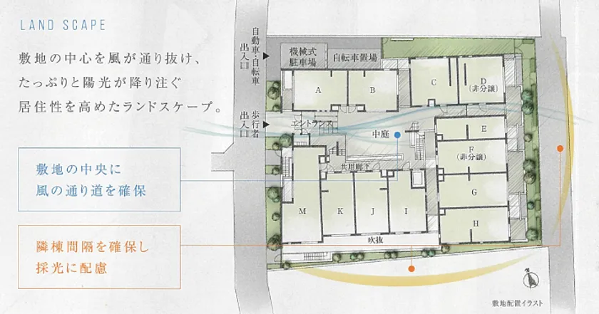 建物は、ロの字型の設計とすることにより角住戸比率が高く、外気に触れる壁面を増やすとともに、中庭や吹抜空間を通じて空気の流れをつくり出すことで居住性と開放性を高める配棟計画に。一般的なマンションではあまり見られない、ゆとりある設計としました。