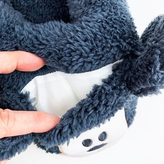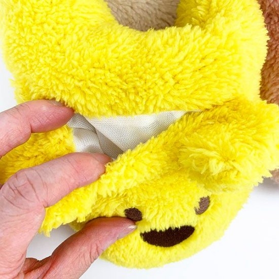 お顔の部分にはこんな風にポケットが付いていてカイロを入れていただけます。スリッパが足元を寒さから守ってくれて、カイロがほかほかにしてくれる仕組みです♪これはアイデア商品ですよね。