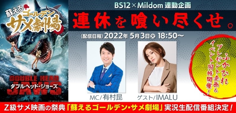 5月3日(火)にBS12にて「ダブルヘッド・ジョーズ」「トリプルヘッド・ジョーズ」のテレビ放送中、同時刻にMildomで実況生番組を配信。MCには映画評論家の有村昆、ゲストにサメ好きな“IMALU”を迎え番組を盛り上げる。テレビで映画を観ながら、お手元のスマホ・PC等で実況を楽しもう!
