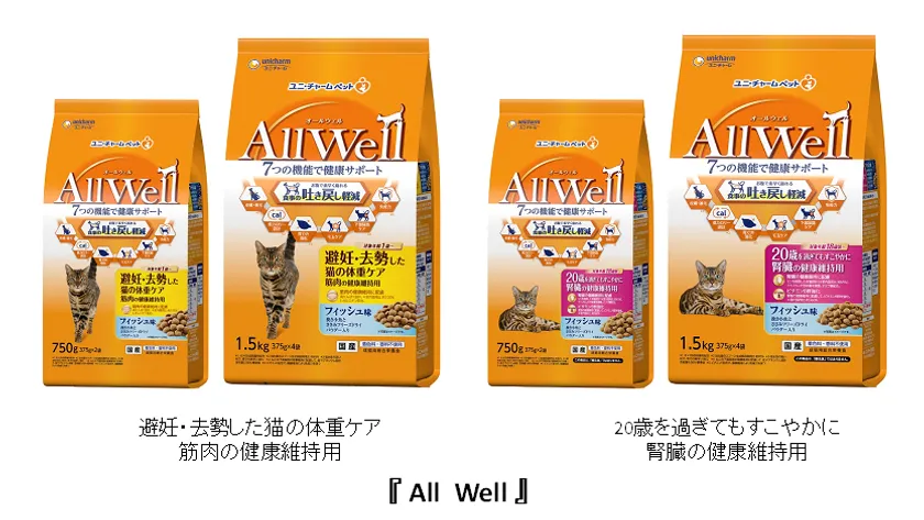 ユニ・チャーム株式会社(本社:東京都港区、代表取締役 社長執行役員:高原豪久)は、2020年3月新発売以降、多くの方にご利用いただいている猫用健康機能食「All Well」から、最新の使用実態、ニーズに対応した「避妊・去勢した猫の体重ケア 筋肉の健康維持用」「20歳を過ぎてもすこやかに 腎臓の健康維持用」を2020年9月14日に全国で新発売します。