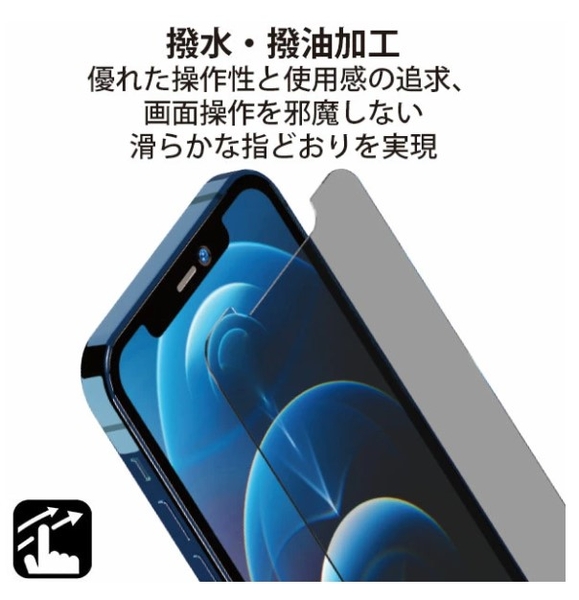 AGC社製の「Dragontrail®」ガラスを採用し、抗菌加工されたiPhone 12用の覗き見防止タイプの液晶全面保護ガラスです。銀イオンの力で細菌やカビなど、さまざまな微生物の増殖を99%抑制します。また、SIAA(抗菌製品技術協議会)規格準拠商品で高い安全性も特長です。一般的なソーダライムガラスと比べ約6倍の強度を誇るドラゴントレイル®を採用し、耐衝撃性に優れています。特殊ブラインド加工により、180°左右からの画面表示を見えづらくし、満員電車などでもプライバシーを守れます。硬度10HのAGC社製強化ガラスを採用し、キズや汚れなどからスクリーンを保護。万が一ガラスが割れても飛び散らない飛散防止加工済み。ガラスの角を丸くしたラウンドエッジ加工や撥水・撥油加工など使用感にもこだわった保護ガラス。また貼り付け時に付く細かな気泡も消える素材を採用しております。ガラスの貼り付けに便利なガイドフレーム・ホコリ取りシール・クリーニングクロスの「貼り付けキット」が付属しています。