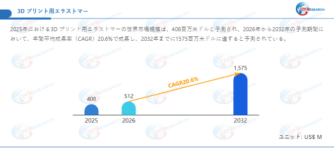 QYResearch調査チームの最新レポート「3D プリント用エラストマー―グローバル市場シェアとランキング、全体の売上と需要予測、2026~2032」によると、3D プリント用エラストマーの世界市場は、2025年に408百万米ドルと推定され、2026年には512百万米ドルに達すると予測されています。その後、2026年から2032年にかけて年平均成長率(CAGR)20.6%で推移し、2032年には1575百万米ドルに拡大すると見込まれています。