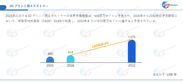 QYResearch調査チームの最新レポート「3D プリント用エラストマー―グローバル市場シェアとランキング、全体の売上と需要予測、2026~2032」によると、3D プリント用エラストマーの世界市場は、2025年に408百万米ドルと推定され、2026年には512百万米ドルに達すると予測されています。その後、2026年から2032年にかけて年平均成長率(CAGR)20.6%で推移し、2032年には1575百万米ドルに拡大すると見込まれています。