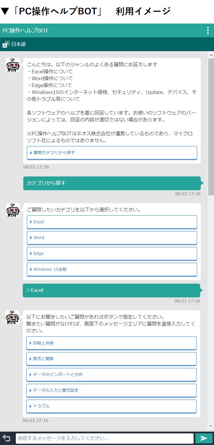 基本的なPC操作やソフトウェアの使用方法等に関するFAQをプリセットすることが可能な、日頃の業務に役立つ「お役立ちBOT」の一つです。「お役立ちBOT」シリーズは、ビジネスユース向けの便利機能として今後も追加予定です。