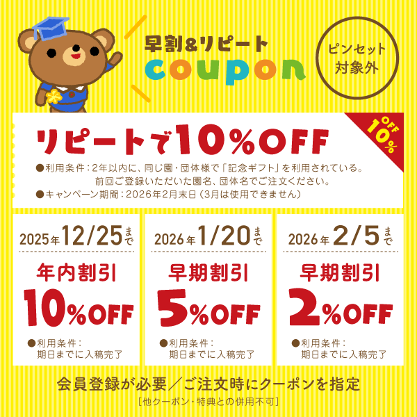 20名さまから注文可能で、お名前のリストはExcelでの入稿も可能。2023年12月25日(月)までのご注文であれば、年内割引クーポンを使って10%割引されます。また、次年度の担当者さまに喜ばれるリピートクーポンは、早期のご注文でなくてもいつでも10%割引。次年度は、記念品選定にも悩まずさらに割引されるので続けてのご利用がオトクです。