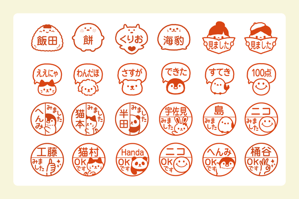 「みました」「OKです」の文字がデフォルトで入ったデザインをご用意しました。お名前を入れることができるため、連絡帳のサインやさまざまなシーンでお使いいただけます。