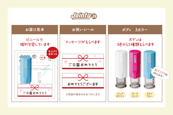 キャップレスで軽い押し心地の回転式ネーム印「Jointy J9」を採用。浸透印ではなくゴム印タイプのため、 イラストの細かい部分も鮮明に表現できます。持ち歩きしやすい工夫がされており、スタンプ台内蔵で連続押印してもかすれません。