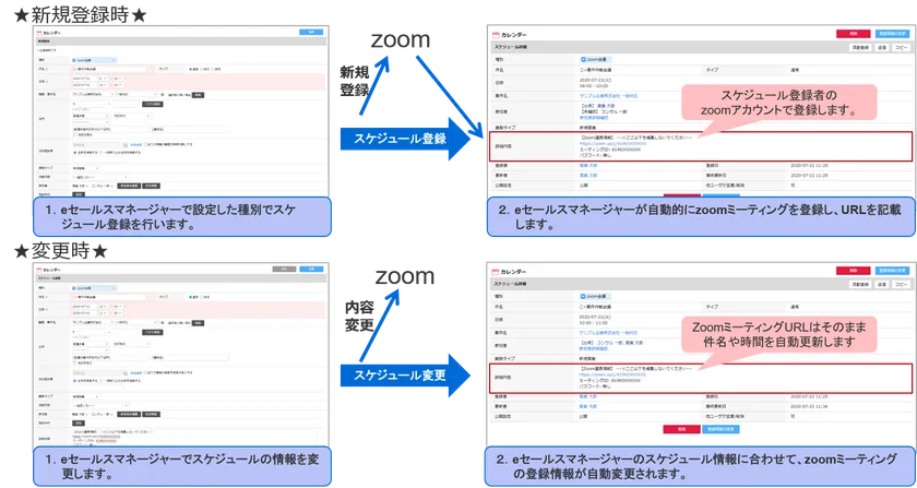 その第一弾としてWeb会議ツール「Zoom」との連携機能を2020年7月27日(月)より追加リリースいたしました。この機能により「eセールスマネージャー」にWeb会議のスケジュール登録をするだけで、自動的にZoomミーティングのスケジュールが登録され、会議URLが発行されるようになります。