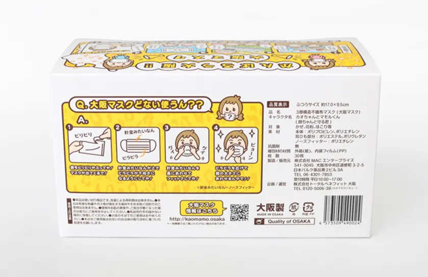 この度、大阪観光局賛助会員 株式会社トータルベネフィット大阪支社は大阪府下の工場で製造された【大阪製/個別包装/不織布マスク】を大阪の街を救う【大阪マスク】と命名し、「大阪マスクプロジェクト」を立ち上げました。